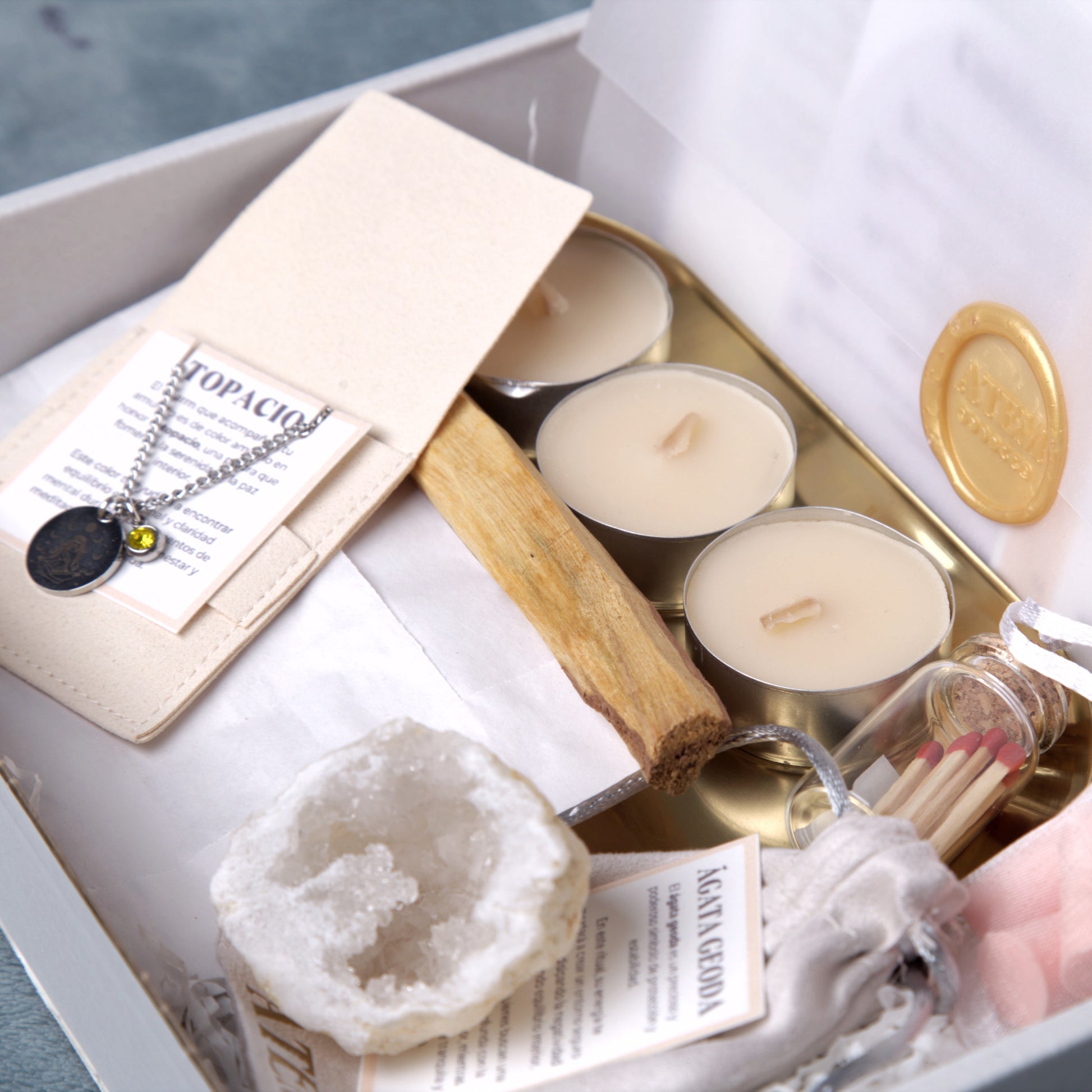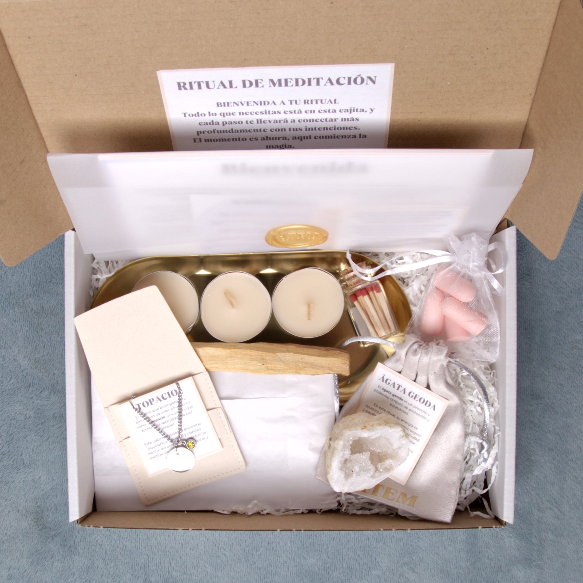 - Un sobre con instrucciones detalladas para guiarte en tu meditación.