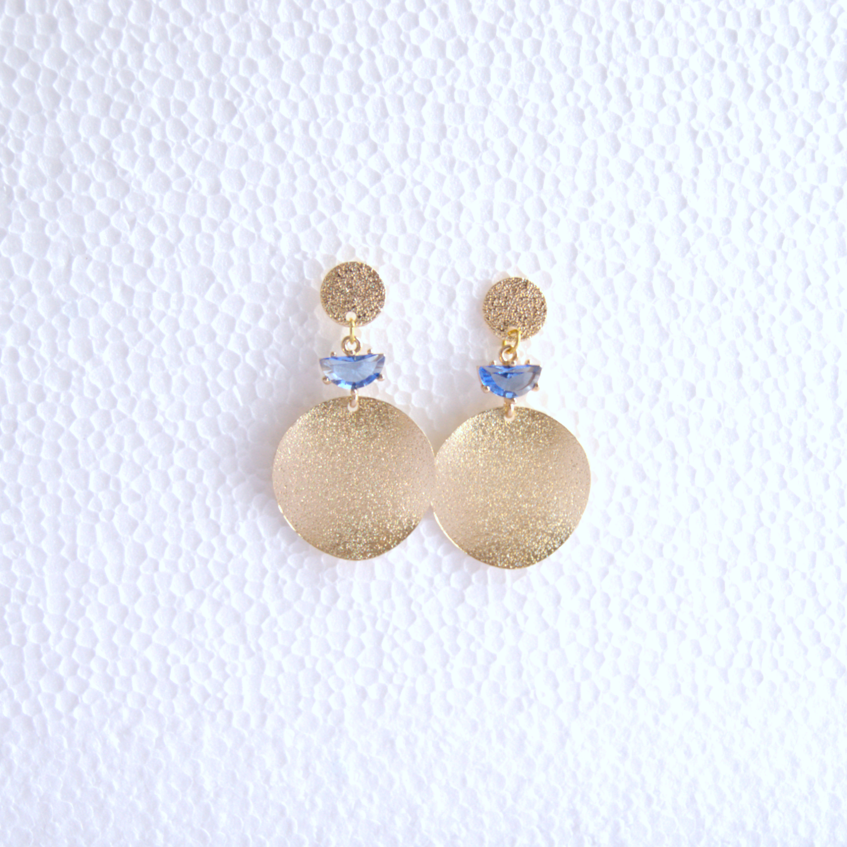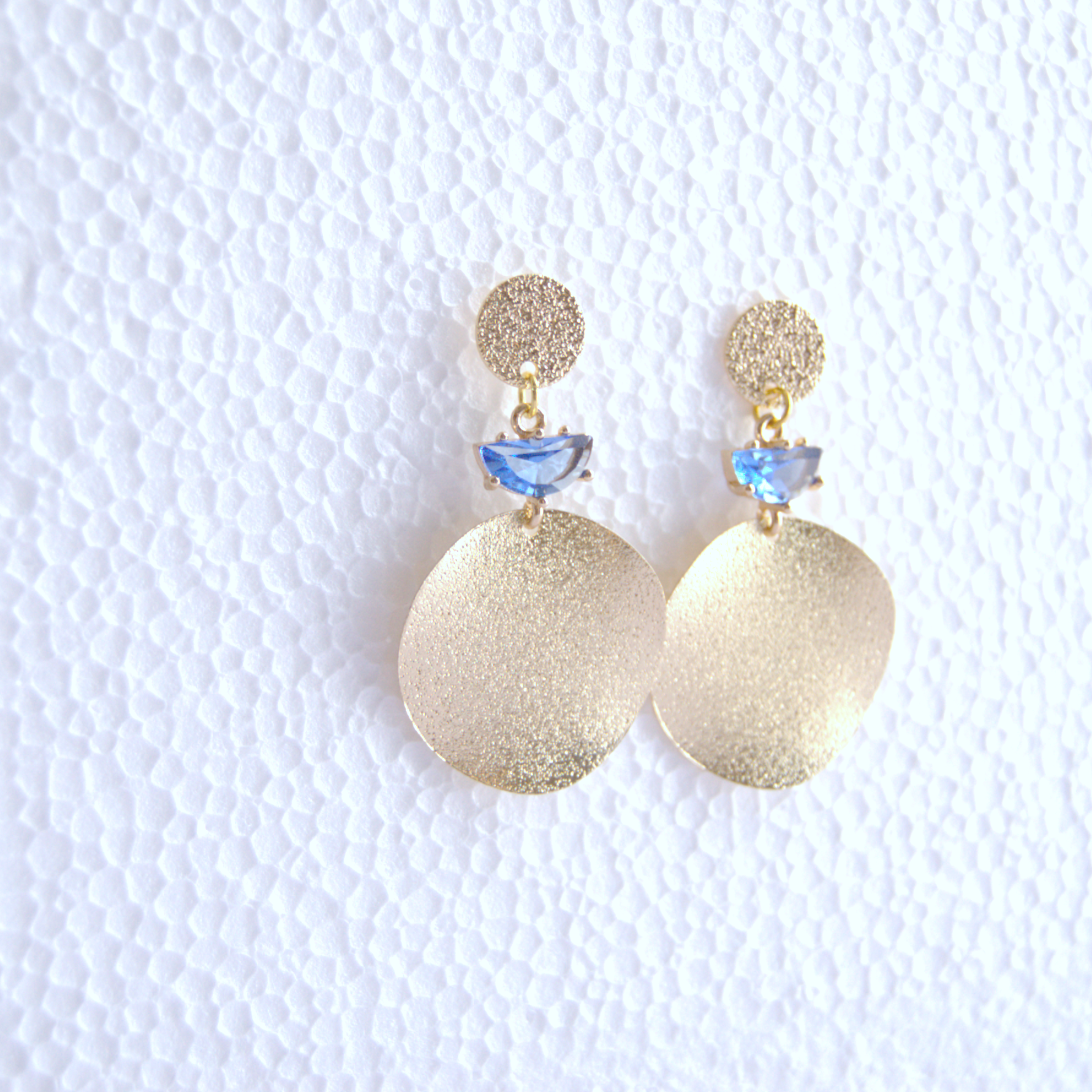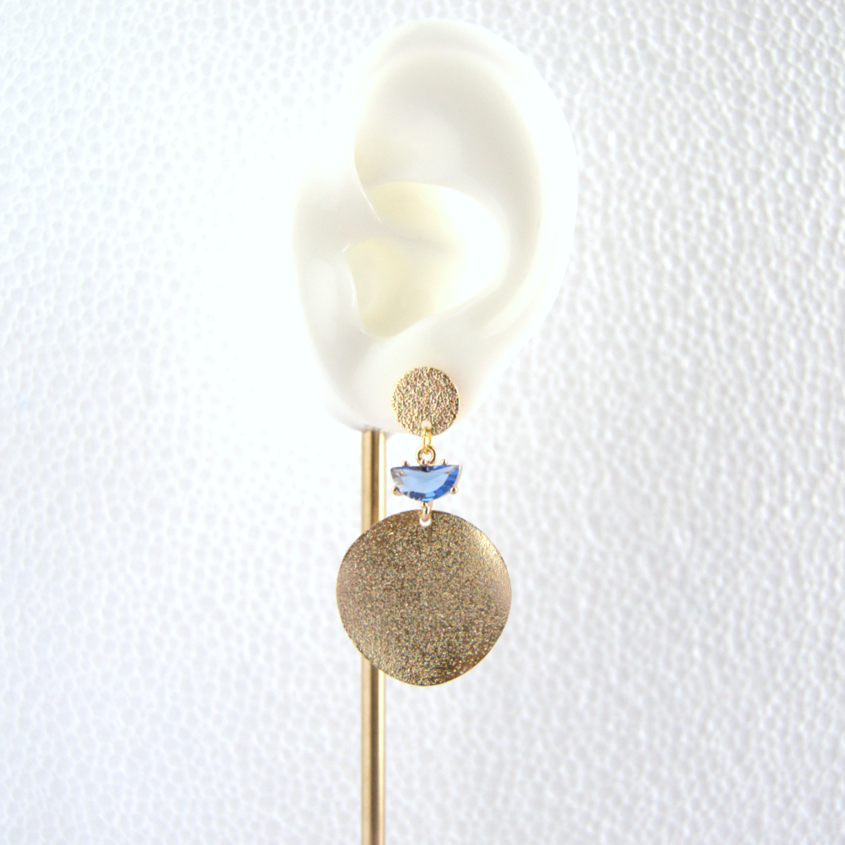 Cada pieza tiene dos discos circulares de latón chapado en oro 18k, uno grande y otro más pequeño, unidos por un zircón azul clarito. Estos discos representan la unión y el equilibrio eternos, mientras que el cristal simboliza la pureza y la claridad de la diosa