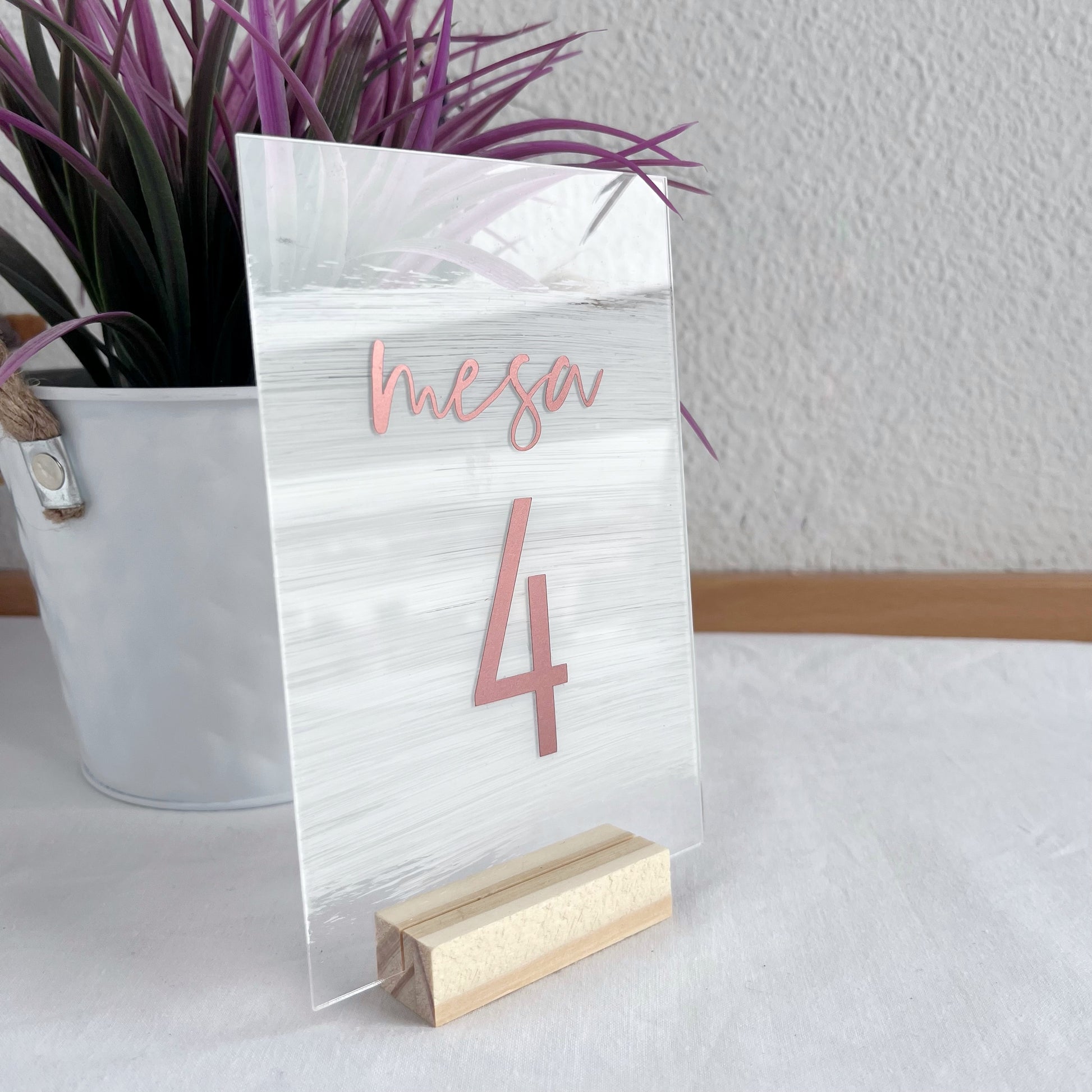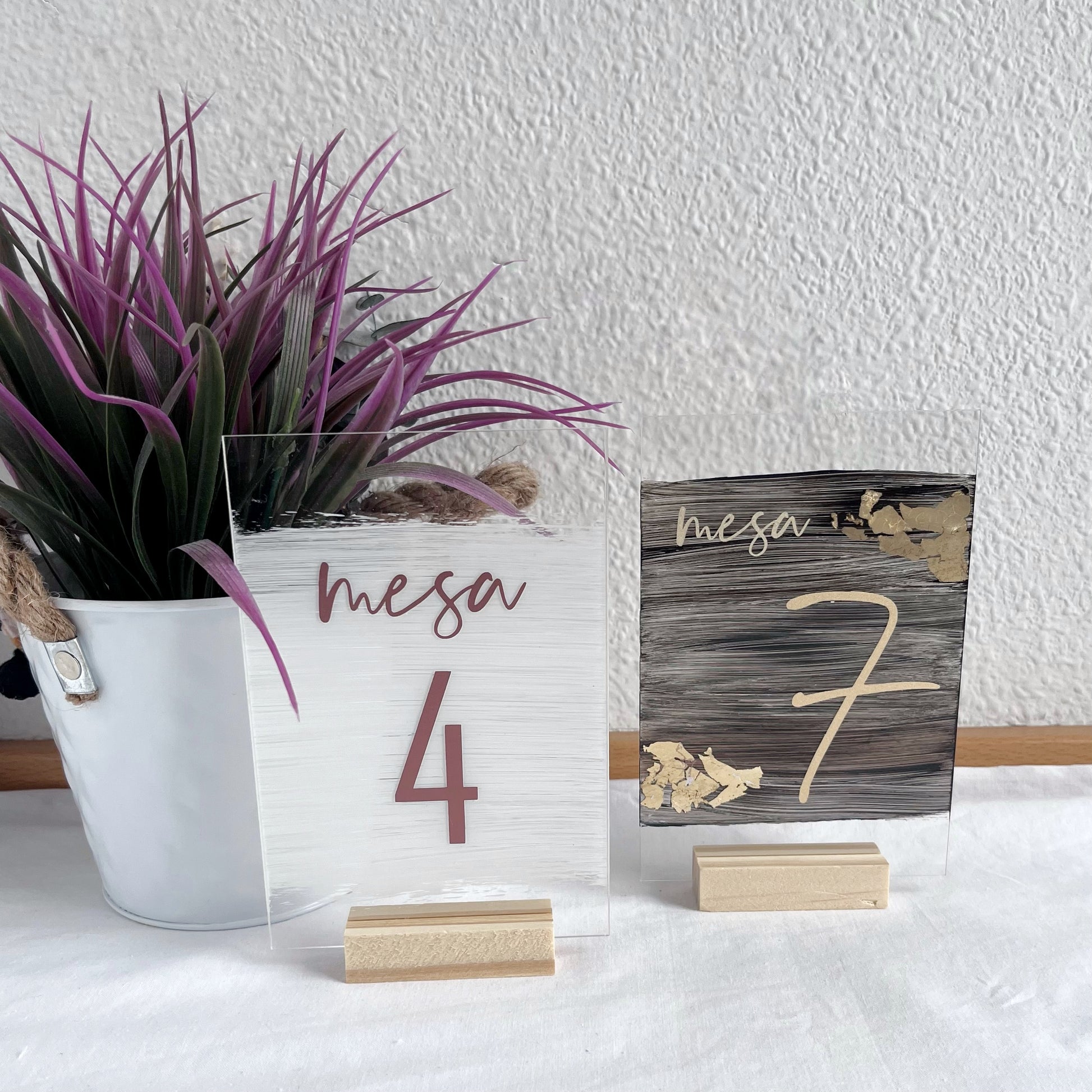 Hechos de metacrilato y personalizados con el nombre o número de la mesa, destacan por su diseño limpio y su base de madera natural que aporta estabilidad y combina con cualquier decoración.