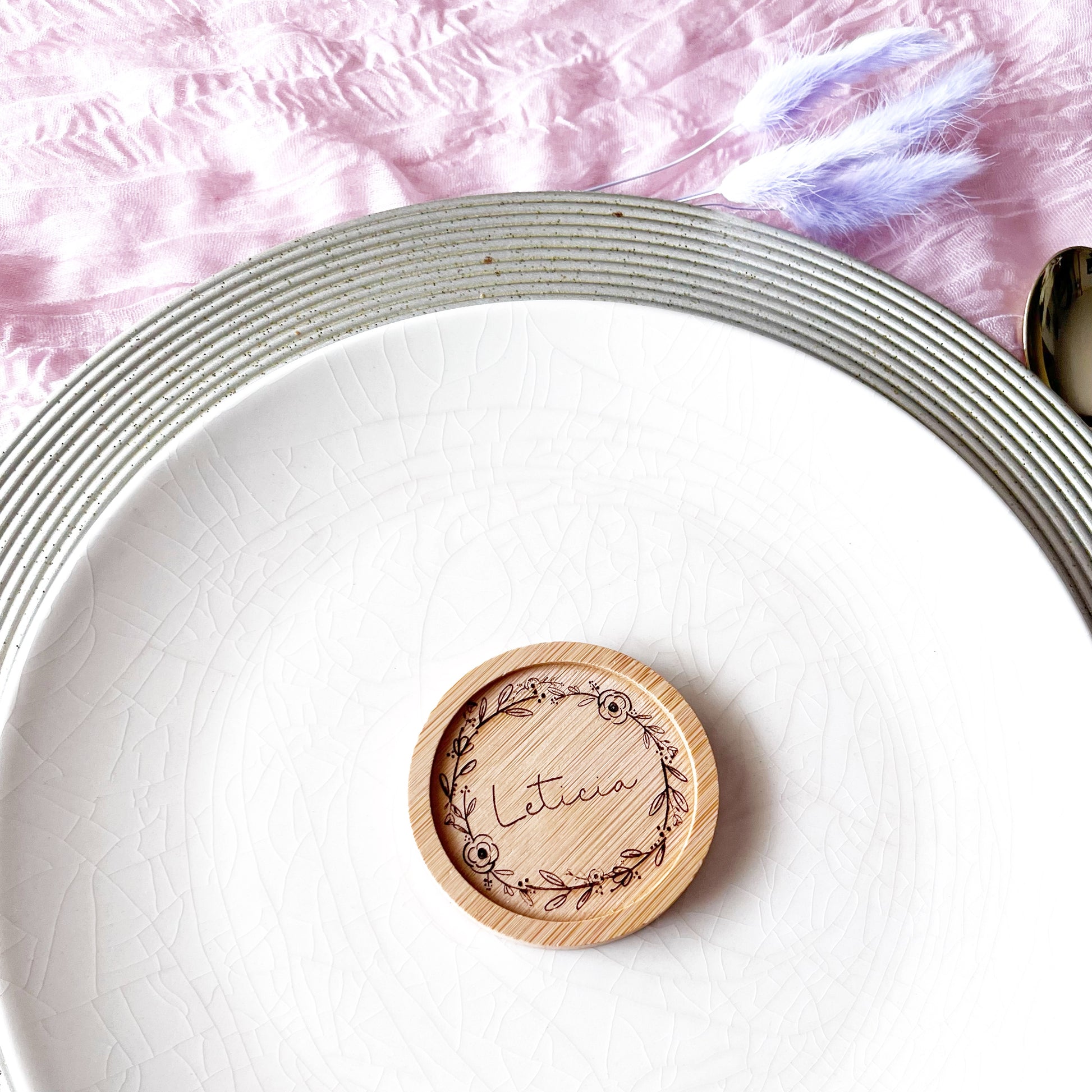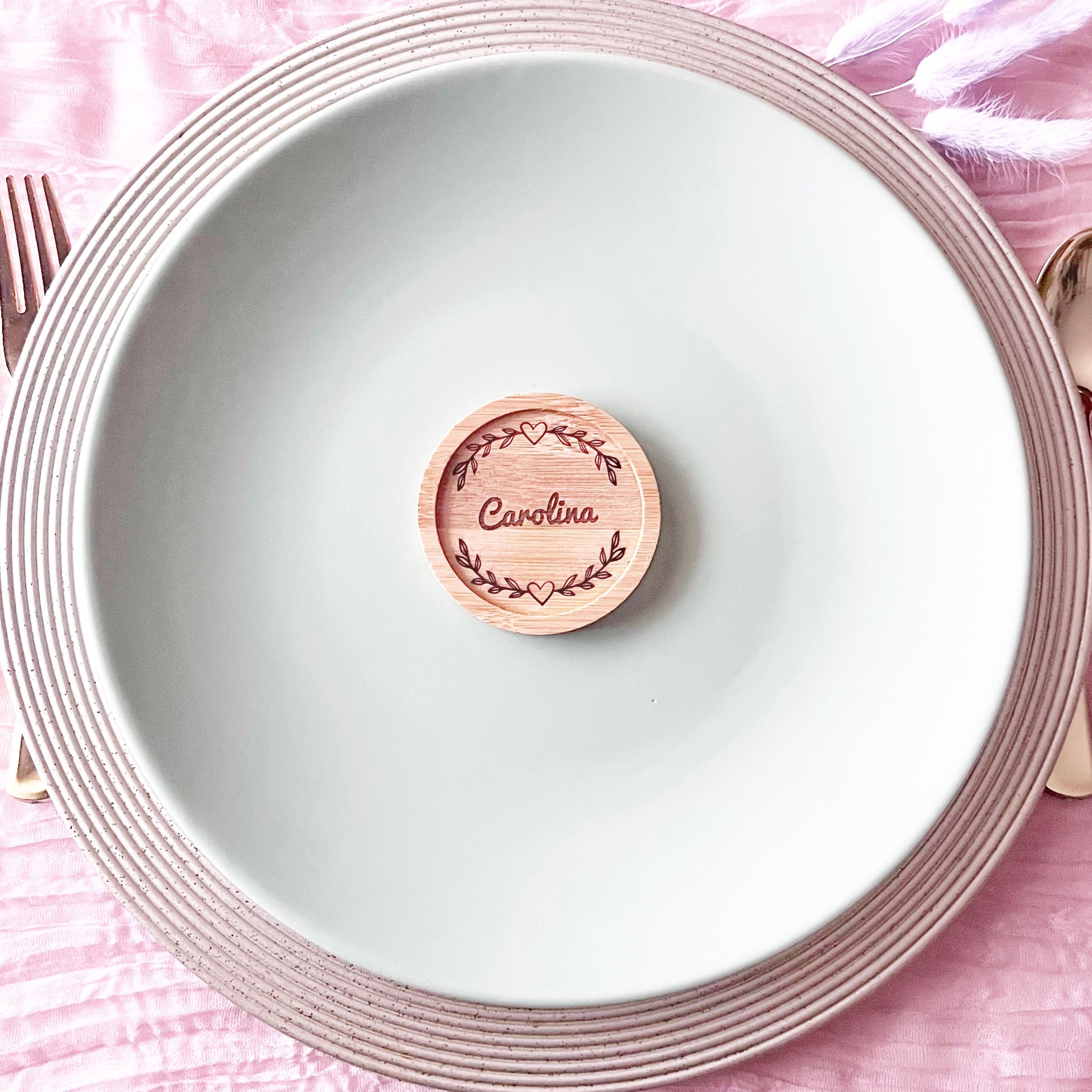 Puedes elegir entre dos materiales —corcho o madera— y personalizarlos como prefieras: todos iguales o con el nombre de cada invitado. Son ese tipo de recuerdo que no solo decora, sino que también se usa y se guarda con cariño.
