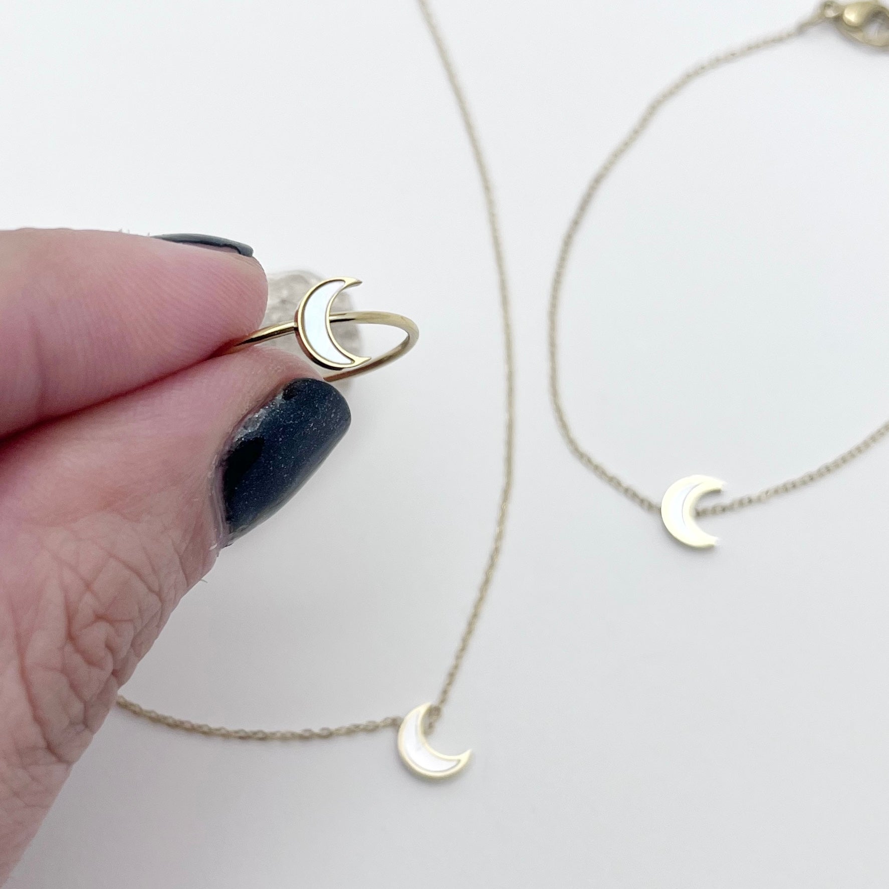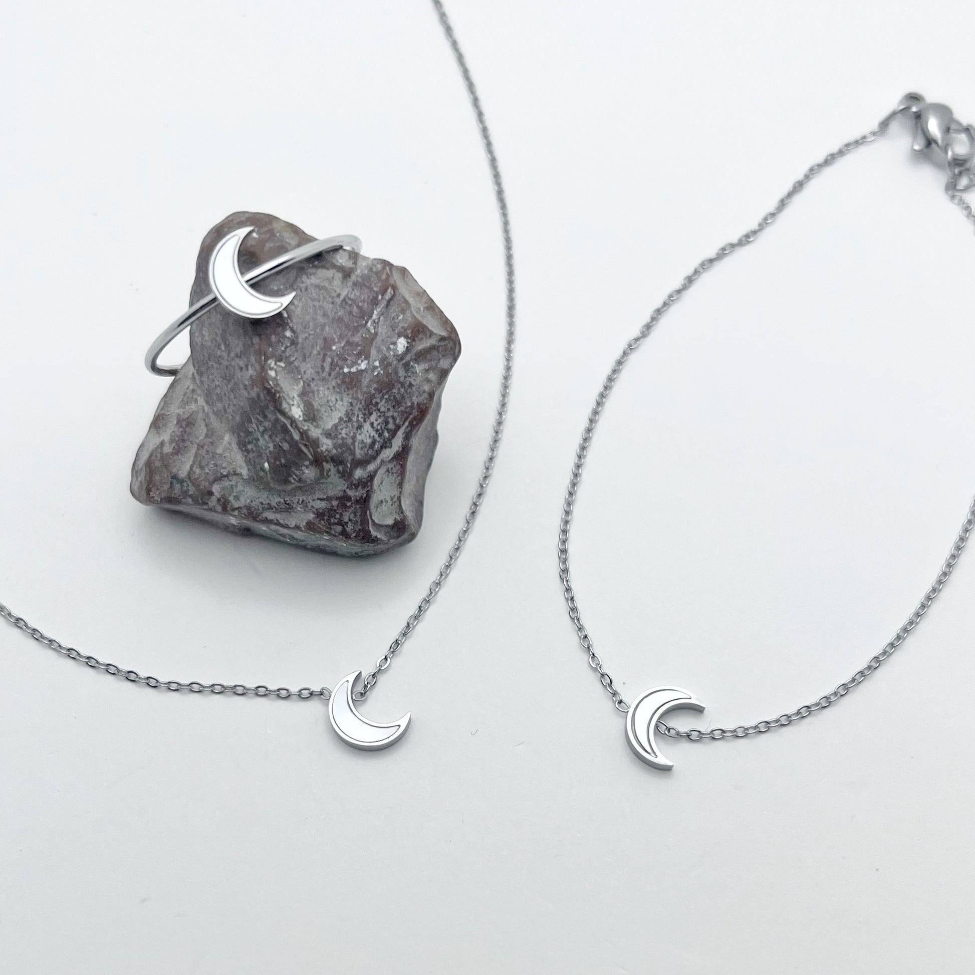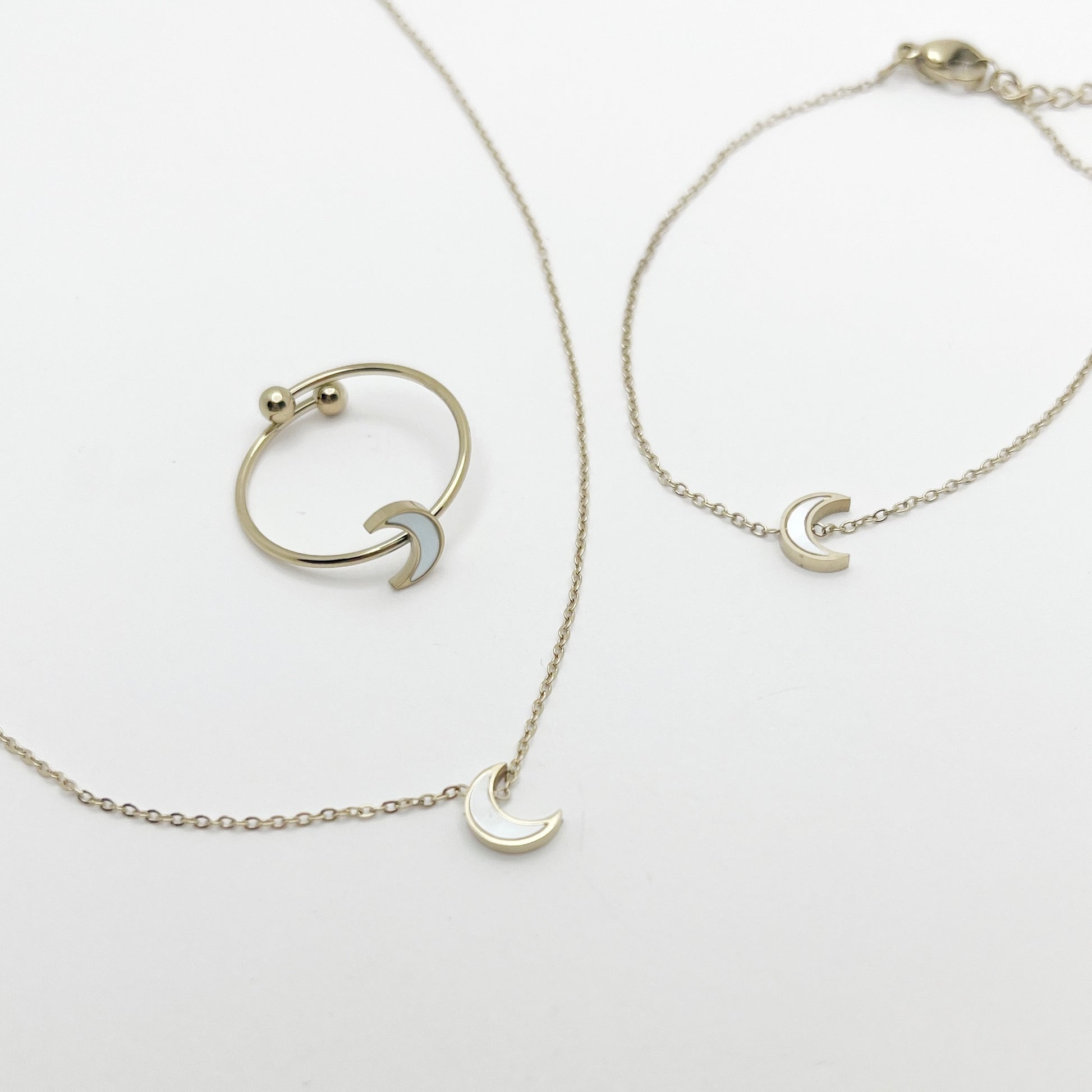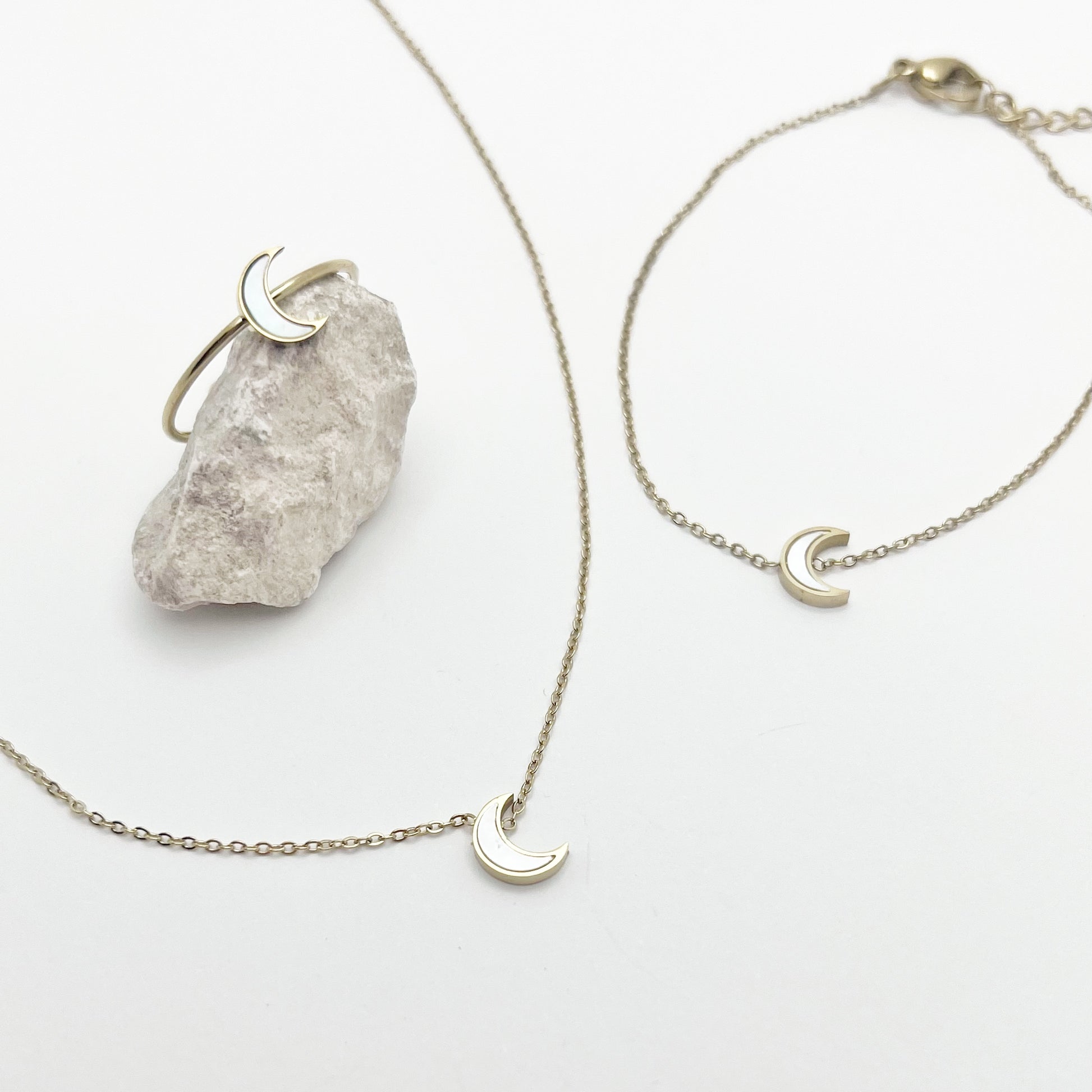 Tres piezas delicadas con una pequeña luna de nácar, diseñadas para llevar juntas o por separado, siempre con ese toque especial que hace que brillen solas.