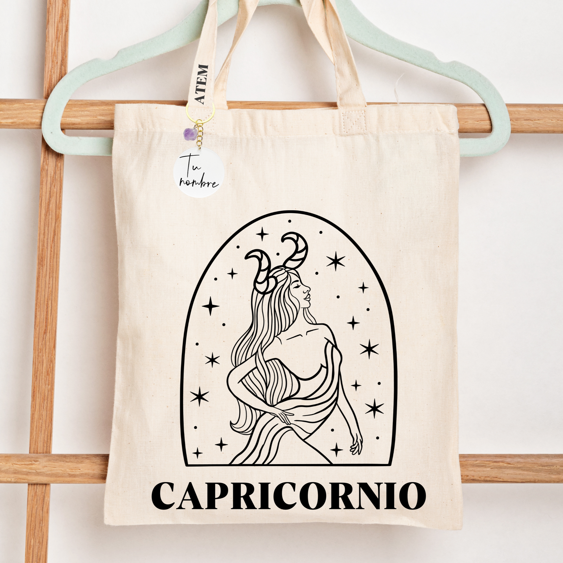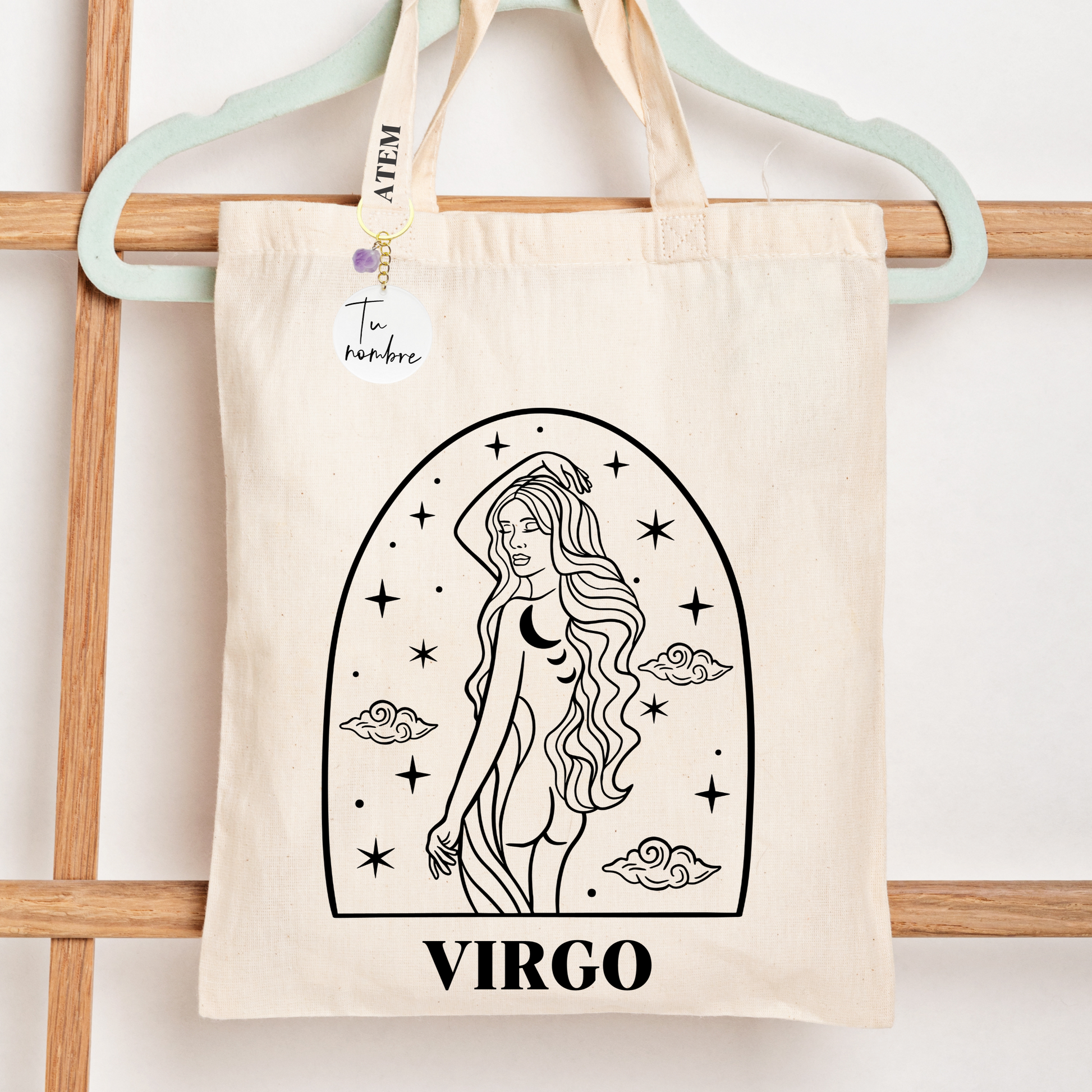 Descubre estas tote bags especiales 100% algodón, diseñadas para quienes buscan un toque único y personal en su día a día. Cada bolsa está decorada con una ilustración exclusiva de mujeres que representan cada signo del zodiaco, en vinilo textil negro y planchadas a mano, asegurando un acabado duradero y de calidad.