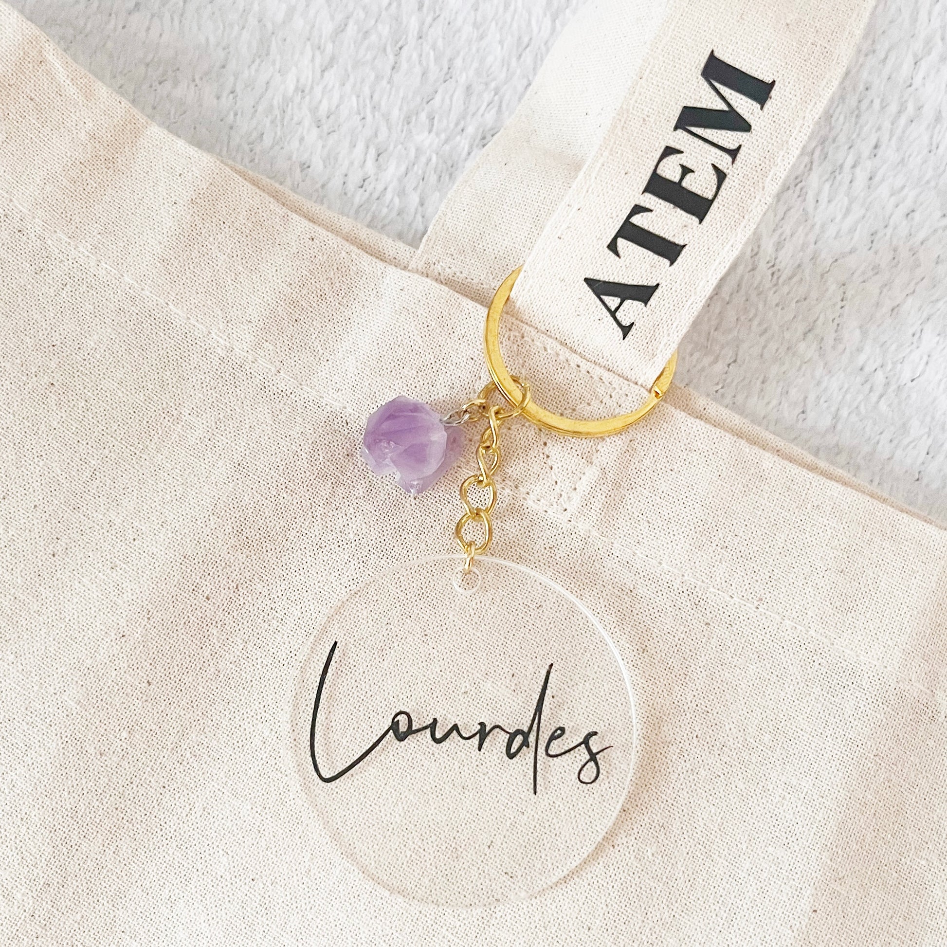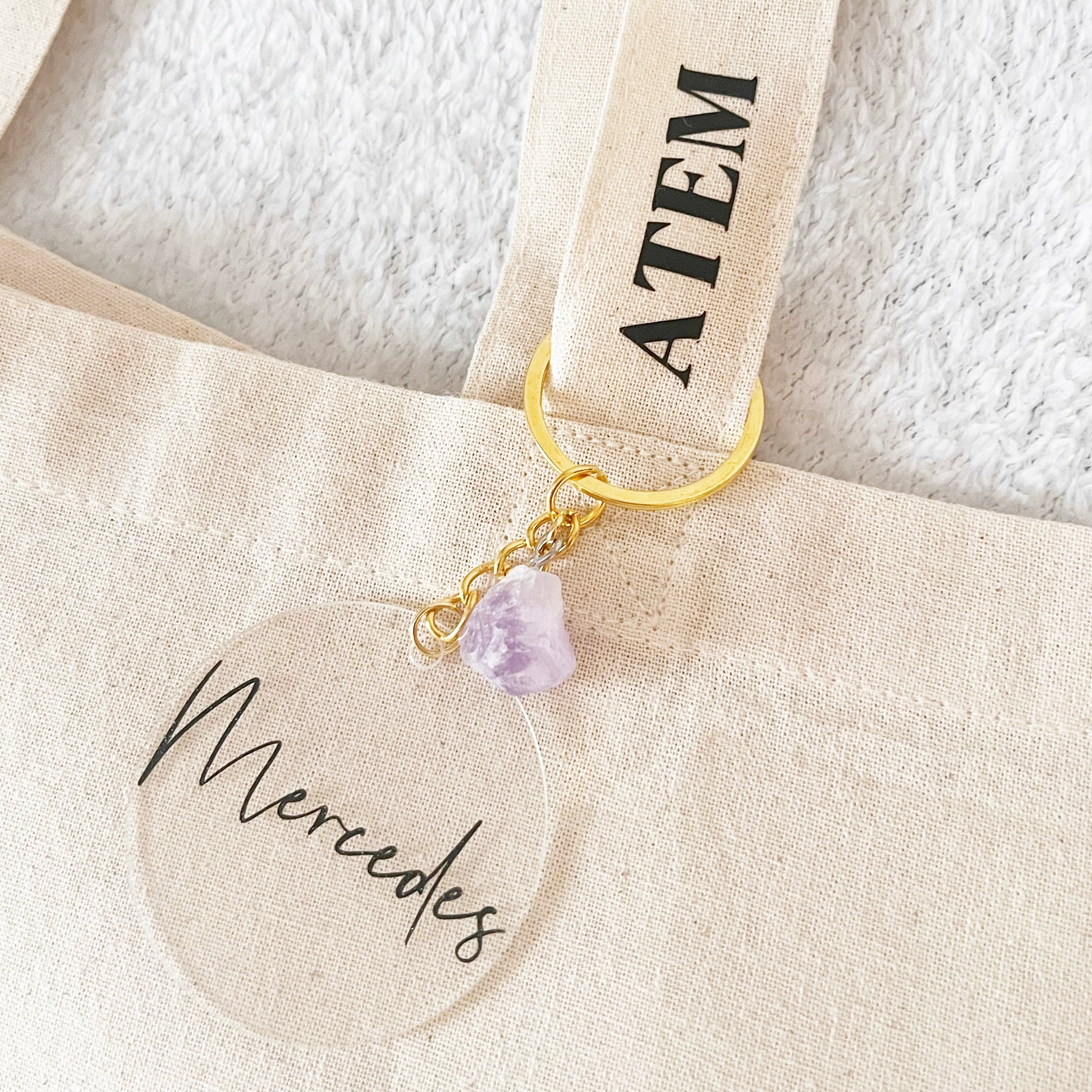 Para completar el estilo, cada tote bag incluye un amuleto energizado bajo la luz de la luna llena: un colgante personalizado con tu nombre y un charm con una piedrecita de amatista natural, para aportar un toque especial que resalte tu conexión espiritual. Puedes quitar este amuleto y usarlo como llavero, pero estoy segura de que siempre querrás llevarlo contigo.